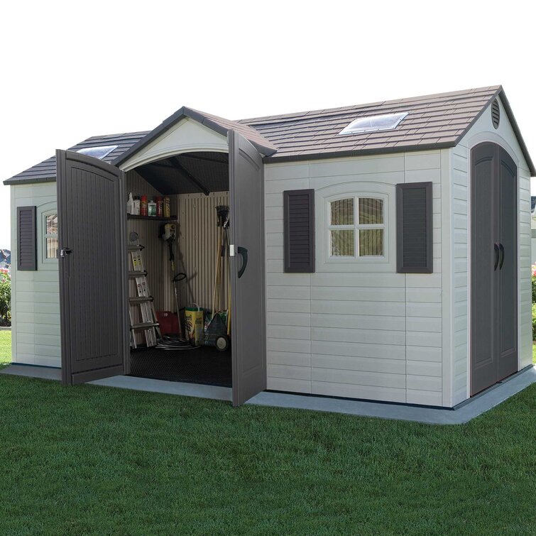 This 15 ft. W x 8 ft. D Apex Plastic Shed is not only built for superior strength and durability, but it also has an attractive appearance and design to accent the beauty of your backyard. The convenient, centralised location of the doors allows for easy access to your storage without having to climb over things to reach items stored in the back.