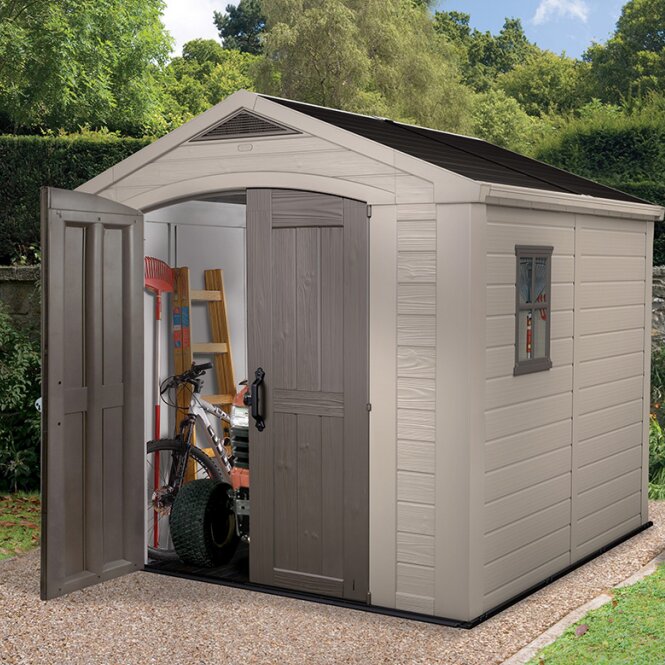 This practical tool shed provides ample space for a variety of tools and equipment, offers room for bicycles and is high enough for a ladder. Due to its robust structure with steel reinforcements, this garden shed is particularly durable. The two wide doors can be easily closed and the stainless steel locking system provides additional security – please note that the lock is not included. The high-quality shed is equipped with a roof hatch and a stylish window to allow more natural light and it comes with two handy shelves. This indispensable piece of garden equipment is easy to assemble using standard household tools.
