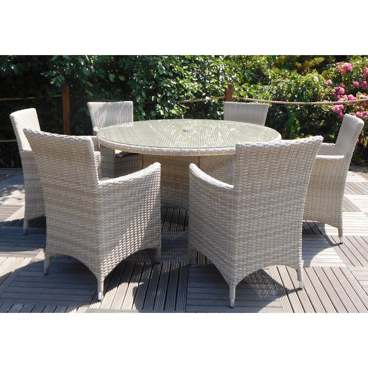 This Currier 6 Seater Dining Set with Cushions is perfect for that al-fresco dining experience with its timeless design. Retaining classic style with its aluminium framework construction and hand-woven synthetic half round weave rattan it offers style, comfort, strength and durability. Complete with 140cm tempered glass top table and 6 Carver chairs including weather shield seat cushions, it is perfect for use all year round and will provide years of enjoyment.