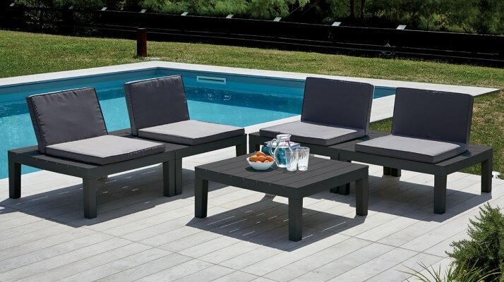 Outdoor set consisting of 4 seats and a modular coffee table, with cushions. The product is 100% made in Italy. Entirely made of resistant polypropylene, it can be positioned outdoors, easily resisting sunlight and rain. Modular at will thanks to 1 multifunctional module that can be positioned at will as a coffee table, as an extension to transform the armchair into a bed, or placed in the corner of the composition – perfect to spend your time, much appreciated in bars, clubs in their dehors or outdoor spaces.