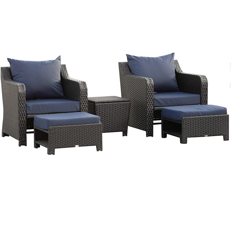 Sit back and relax comfortably this season, thanks to this rattan chair and stool set from Rosalind Wheeler. It comes with five pieces – two armchairs, two footstools, and a matching side table. Made from handwoven PE rattan, each piece is weather resistant and low maintenance, with a powder-coated aluminum frame underneath for extra support and stability. There are soft and plush cushions on the chairs and footstools for comfort, and the covers can be removed and washed. Set is finished with the side table, which features handy inner storage and a flat top. Features: Set comes with two armchairs, two footstools, and matching side table Inner storage in the table, small open storage in footstools Solid aluminum frame, wrapped in PE wicker Padded cushions for comfort Set of two is great for relaxing with a friend in the garden and other outdoor areas.