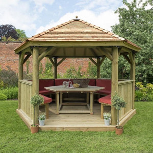 Forest Garden Furnished Cedar Roof Hexagonal Gazebo (W)4260mm (D)3690mm (Red Cushion included).Create the perfect place for al fresco dining with this 4m Furnished Hexagonal Wooden Garden Gazebo with Cedar Roof from Forest. As well as including installation this Gazebo comes with custom made bench seats table and cushions making the creation of your ideal garden dining area easier than you think. The hexagonal table is perfect for dining or drinks and the 5 bench seats will comfortably seat up to 15 adults or 20 children. Made from quality terracotta outdoor canvas the comfortable 3-inch deep cushion set is custom made to fit the corner style benches and for added comfort includes separate back cushions. If you want added protection from the sun or a light shower a set of 6 matching terracotta roll-down curtains are available to purchase separately.