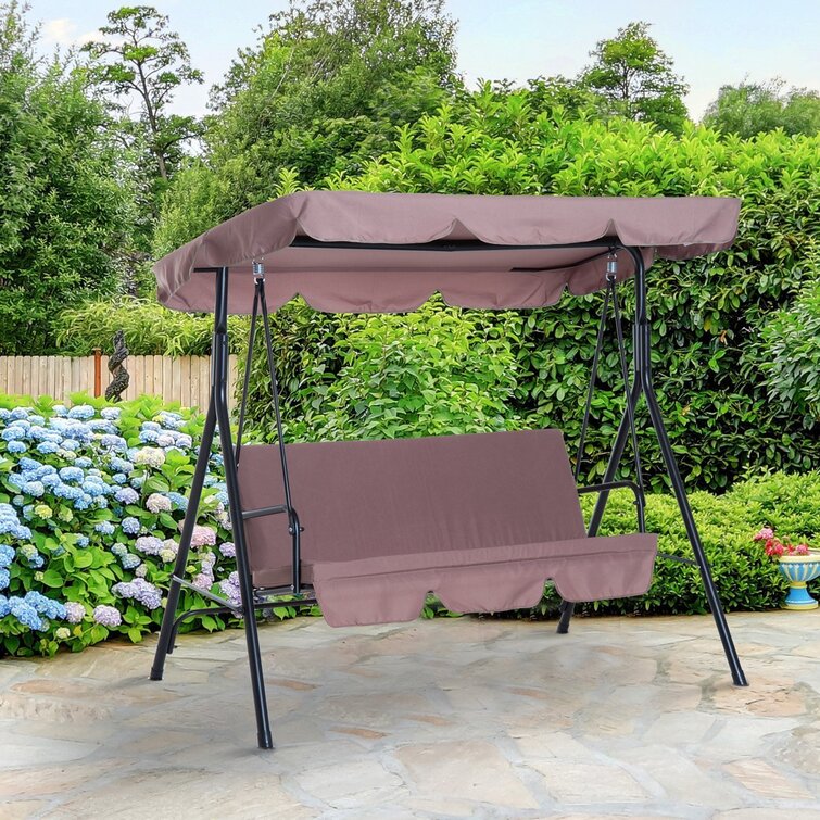 Enjoy relaxing in your outdoor area with this covered park swing. Its frame is made from sturdy and weather-resistant powder coated steel and its seat accommodates up to three people. The seat and backrest include a plush padding and they are upholstered in a soft but durable polyester fabric. This seat also includes a tilting sunshade.